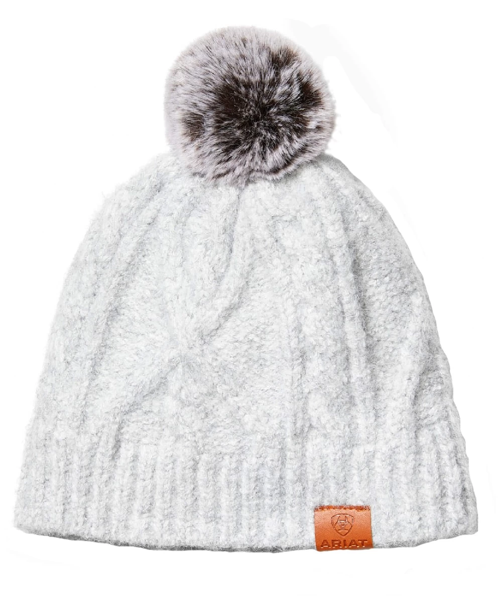 Recycled Polyester Blend Knit; Recycled Fleece Lining; Cozy Cable Knit Styling;Â Faux Chincilla Pom Pom; Color: Sleet Heather/White; Style #10041923