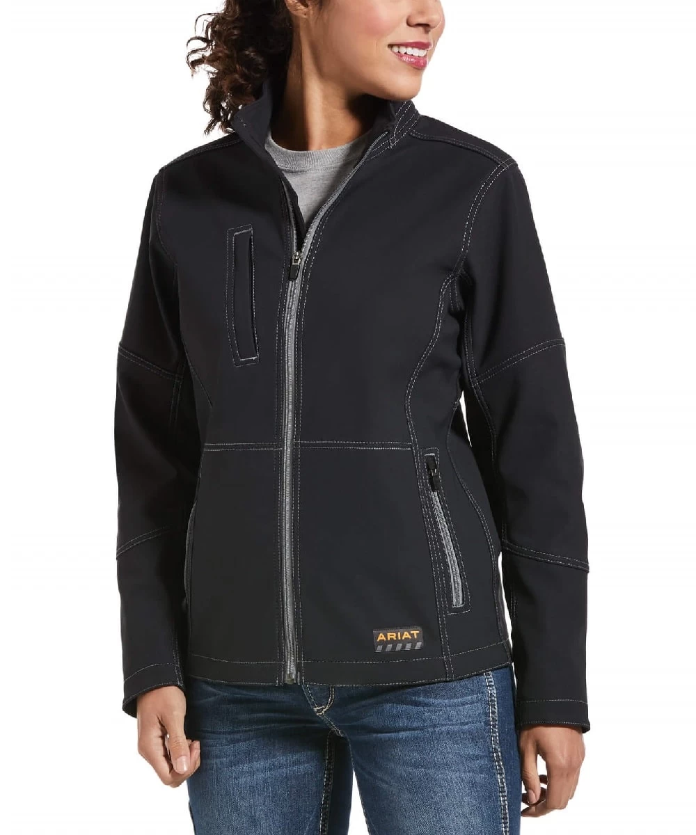 95% Nylon/5% Spandex; Greater Arm Mobility Seam Construction; DuraStretch Fabric For Durable Flex; Wind And Water Resistant With Breathability; Ariat V3 Built-In Stretch Mesh For Breathability And Full Range Of Motion; Stain-Repellant Finish; Abrasion Resistant; Triple Needle Stitched For Added Durability; 9Oz Stretch Canvas Softshell; Brushed Fleece Pocket Lining; Zippered Hand And Chest Pockets; Stretch Mesh Mobility Panels; Storm Cuffs; Mock Collar; Color: Black; Style #10032915