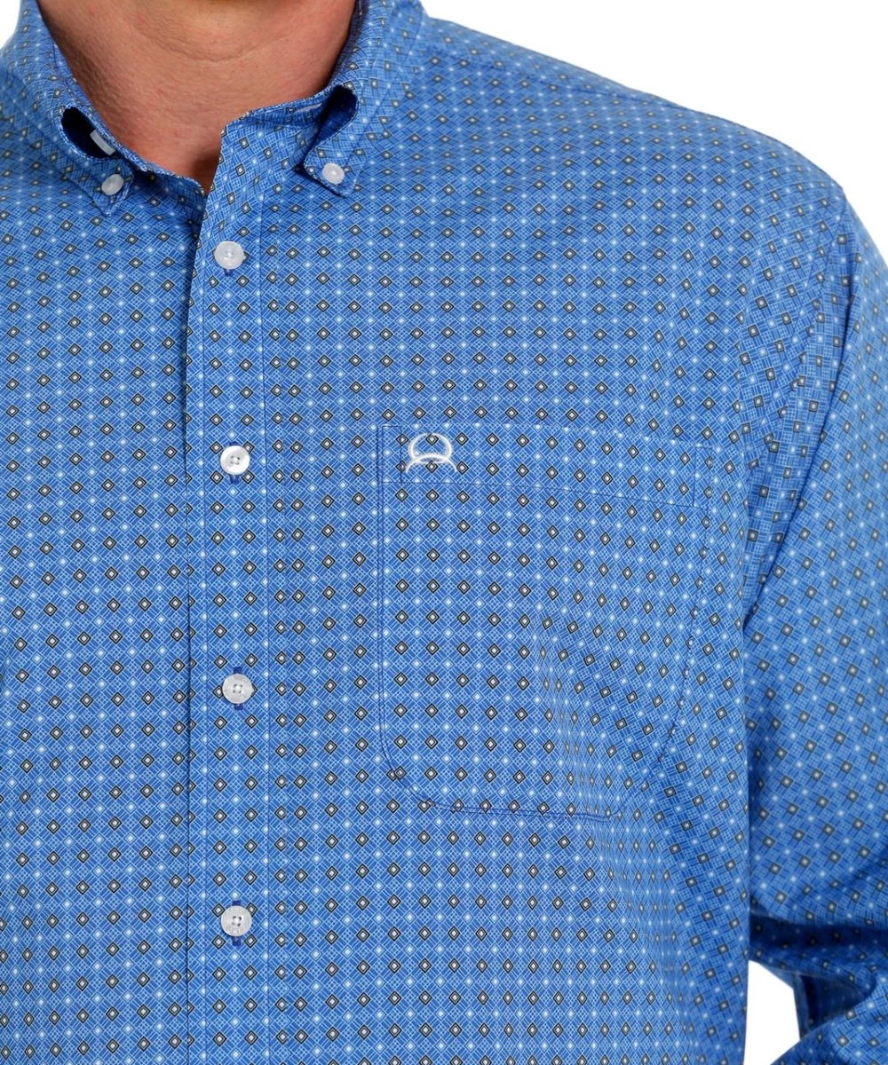 Lightweight Printed Poly-Spandex; Classic Fit; Long Sleeve; Button Down Collar, Placket, And Cuffs; White Buttons; Single Open Chest Pocket With Logo Embroidery; Color: Royal Blue Geo Print; Style #MTW1862017