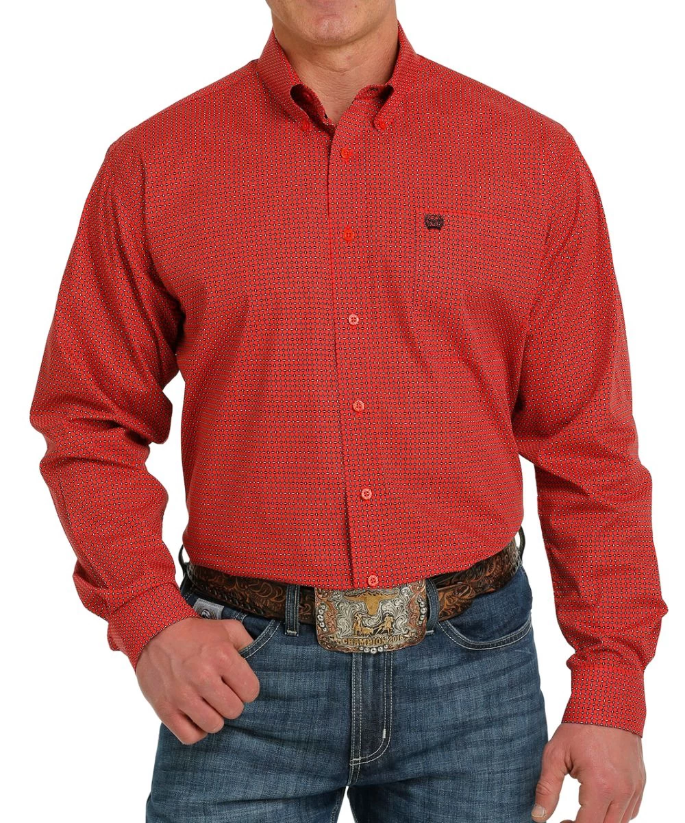 Printed Cotton Plain Weave; Long Sleeve; Button Down Collar, Placket, And Cuffs; Red Buttons; Single Open Chest Pocket With Logo Embroidery; Color: Red Geo Print; Style #MTW1105552