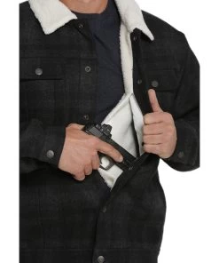 Polyester/Wool; Lined With Luxe Sherpa; Long Sleeve; Spread Sherpa Collar; Full Front Snap Closure; Snap Cuffs; Dual Snap Flap Chest Pockets With Leather Logo Label; Antique Copper Snaps; Dual Hand Pockets; Dual Concealed Inner Pockets; Velcro Backed Holster; Durable Water Resistant Finish; Color: Black Plaid; Style #MWJ1074004