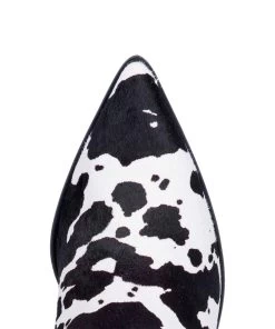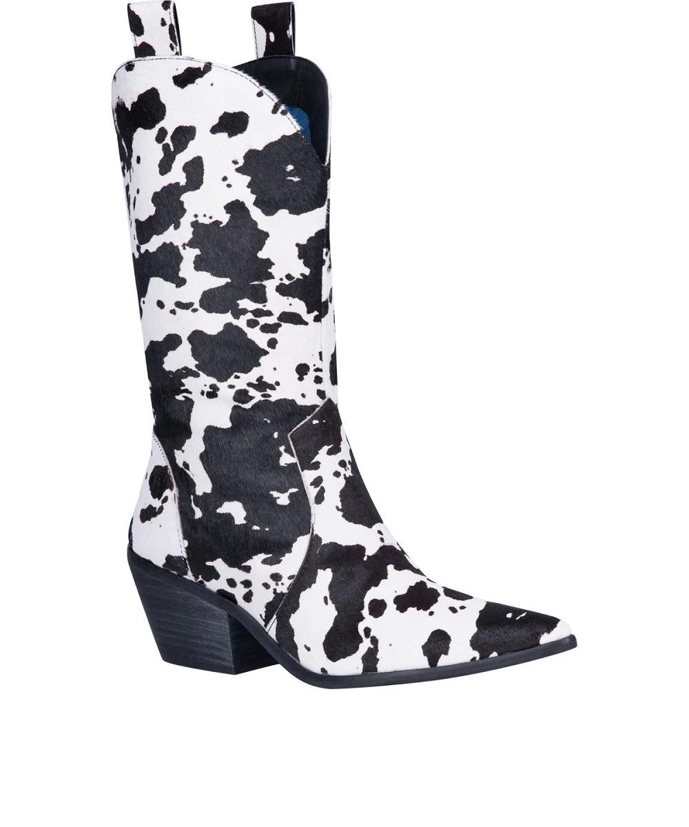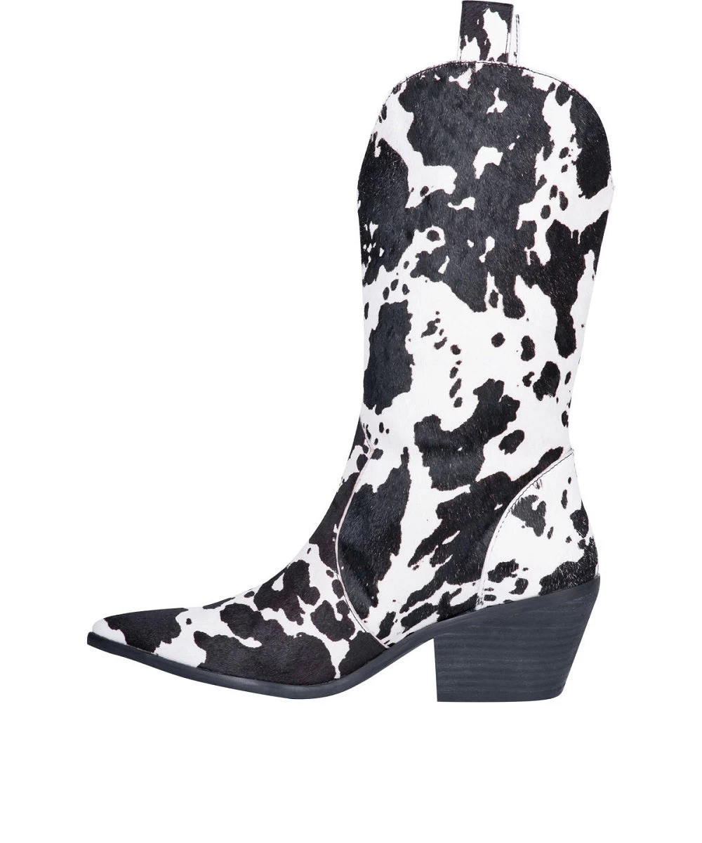 12″ Boot; Leather Construction; Color: Black And White Cow Print; Hinged Cushion Insole; Snip Toe; Unit Heel; TPR Unit Outsole; Style #DI127