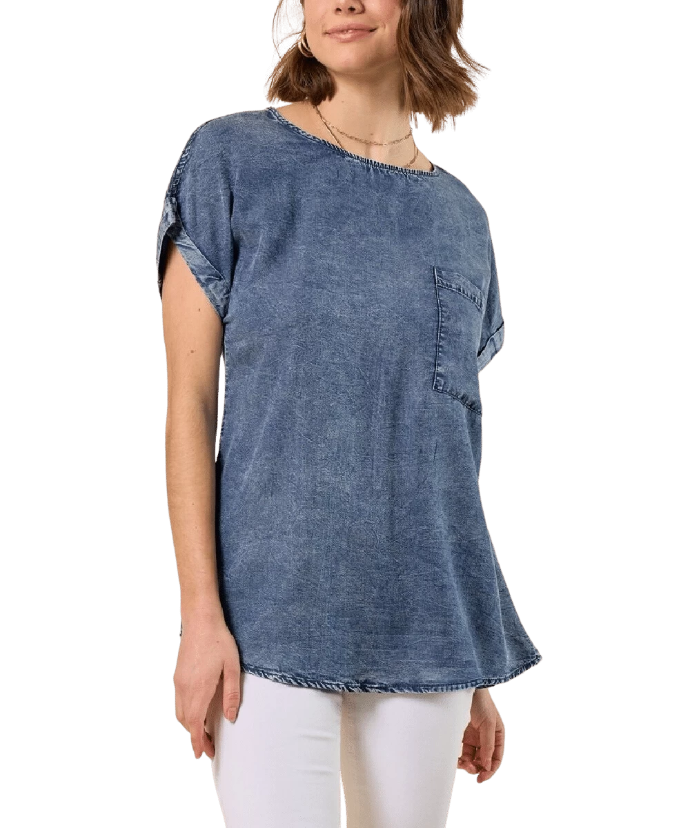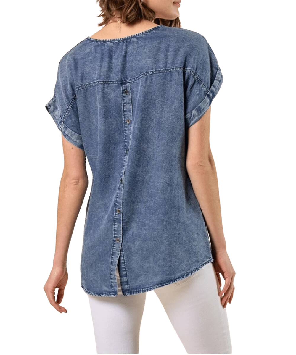 100% Tencel; Short Sleeve; Single Open Pocket; Button Up Back Placket; Stitched Sleeve Cuffs; Color: Denim; Style #40193T