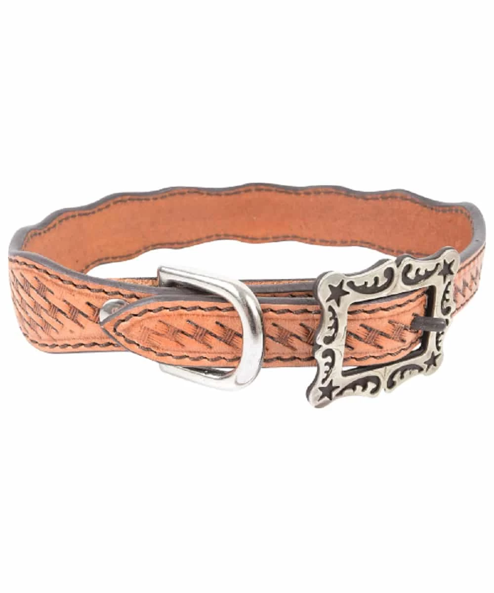 Leather; Basket Weave Tooling; Silver Tone Buckle With Cut Out Designs; Color: Natural; Style #SA-DC7
