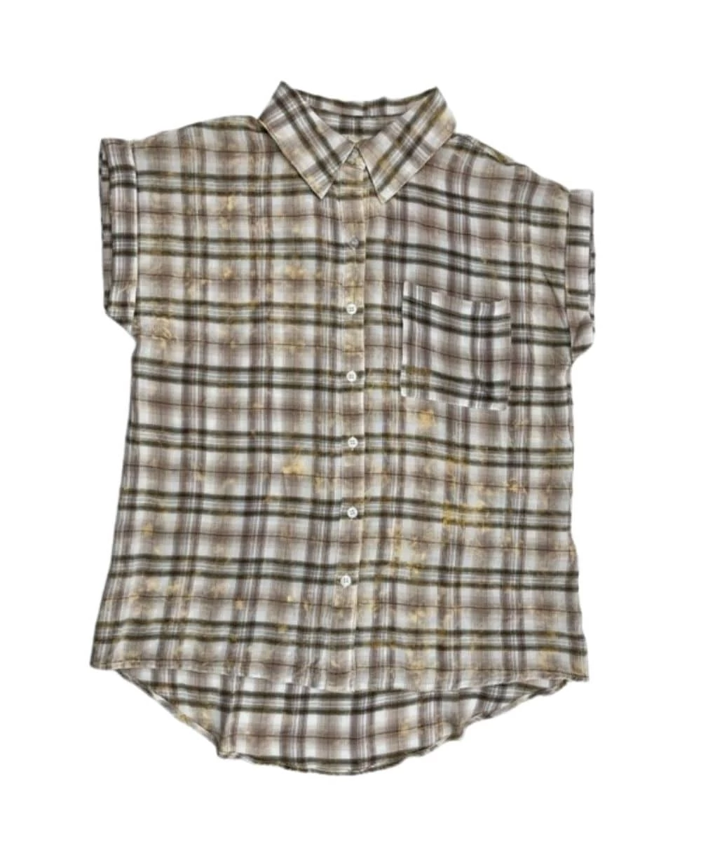 100% Rayon; Color: Off White/Beige/Brown Plaid With Acid Wash Areas Allover; Open Collar; Button Down Closure; White Buttons; Single Open Left Chest Pocket; Short Sleeve; Cuffed Sleeves; High-Low Hem; Soft, Thin, And Lightweight; Please Note That Each Garment Has A Unique Look And Will Have Variations Of Shading And Color; Style #33060F