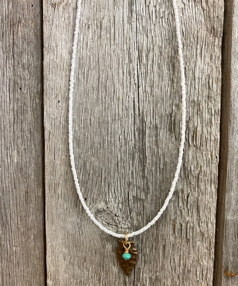 16″ Tiny Seed Beads; Bronze Hammered Arrowhead; Stone Drop; Bronze Lobster Claw Clasp; Color Options: Black, White And Turquoise; Style #17082