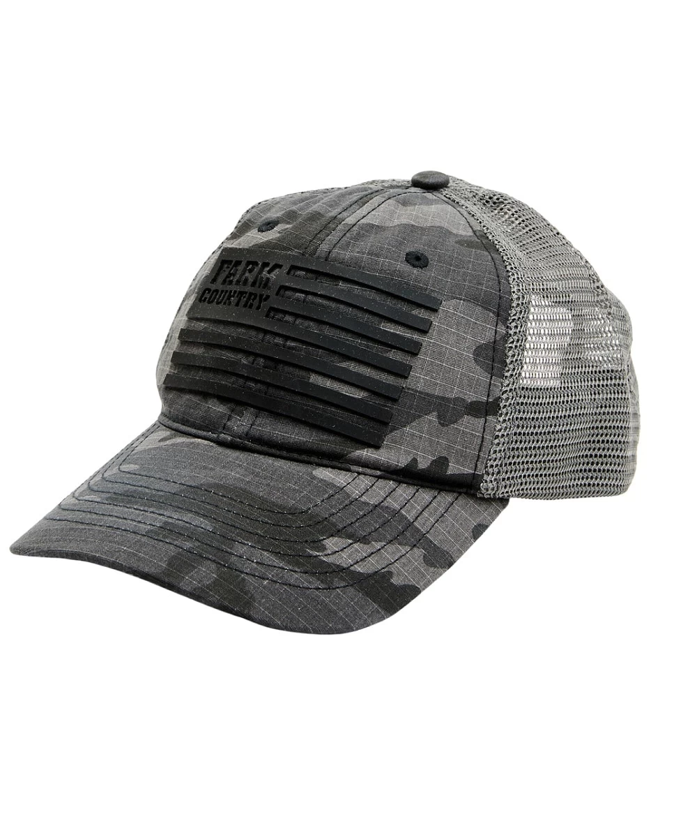 Six Panel Construction; Camo Front Crown And Bill; Olive Green Mesh Back; Front Black Rubber 3D American Flag On Center Crown Reads: Farm Country; Back Logo Patch; Snap Back Closure; Style #13080903