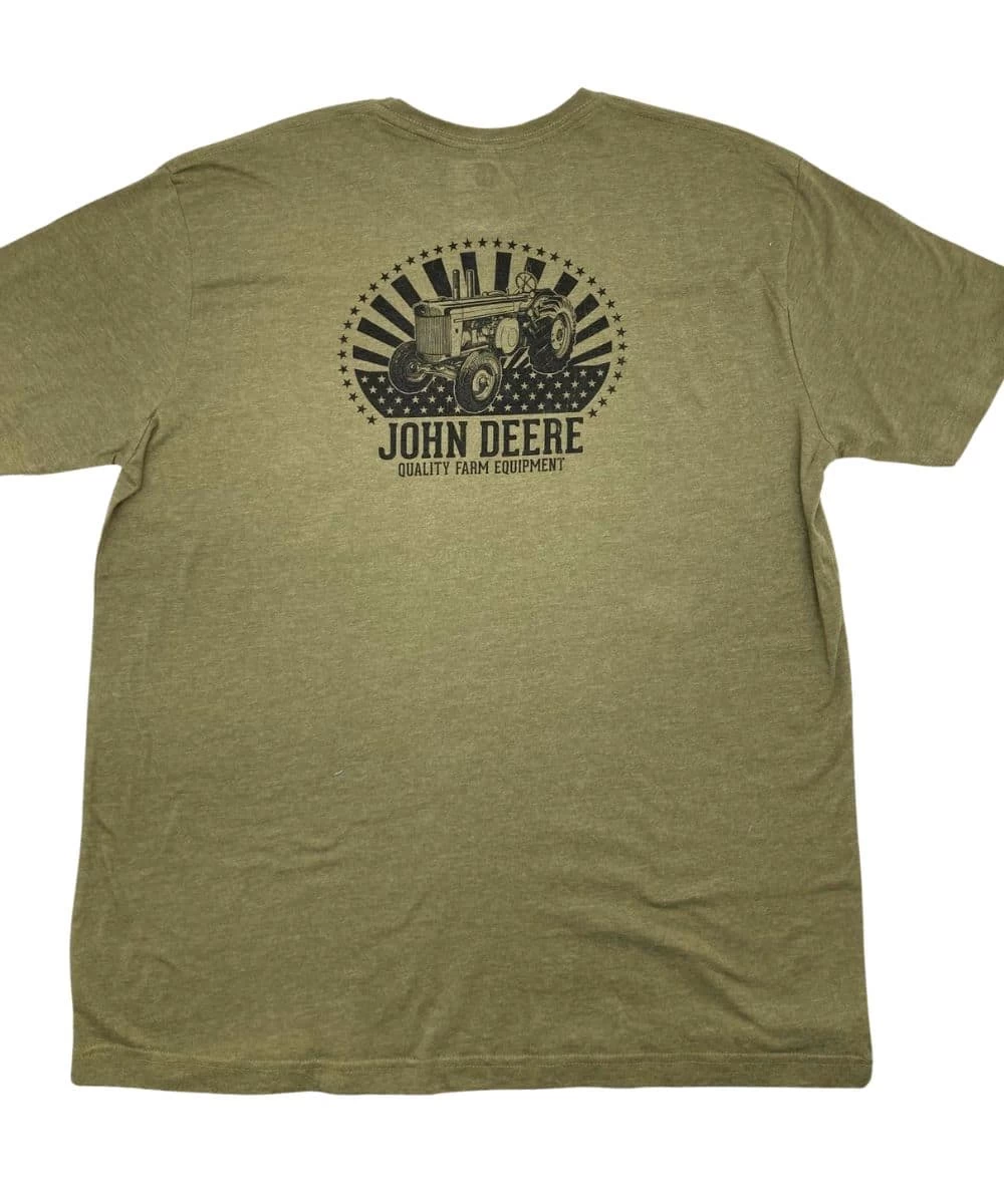 60% Cotton/ 40% Polyester; Color: Heather Olive; Crew Neck; Short Sleeves; Black John Deere Logo On Left Chest; Vintage Tractor With Flag Background On Back; Design On Back Says “John Deere Quality Farm Equipment”; Style #13282144