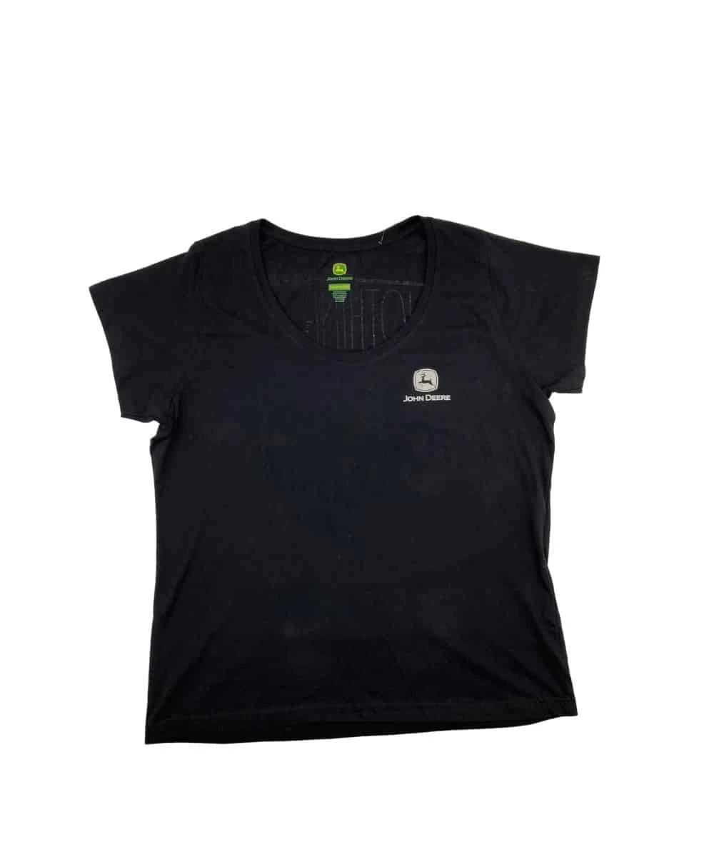 100% Cotton; Color: Black; Scoop Neck; Gray John Deere Logo On Left Chest; Short Sleeves; Back Says “Nothing Runs Like A Deere”; Style #23375741