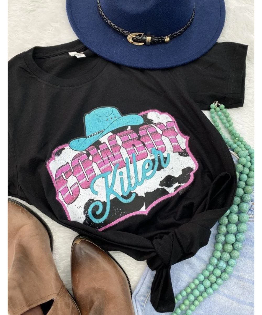 Color: Black; Crew Neck; Short Sleeves; Design Says “Cowboy Killer” With Cow Print Background, Pink Frame, And Turquoise Cowgirl Hat; Style #BC COWBOY KILLE