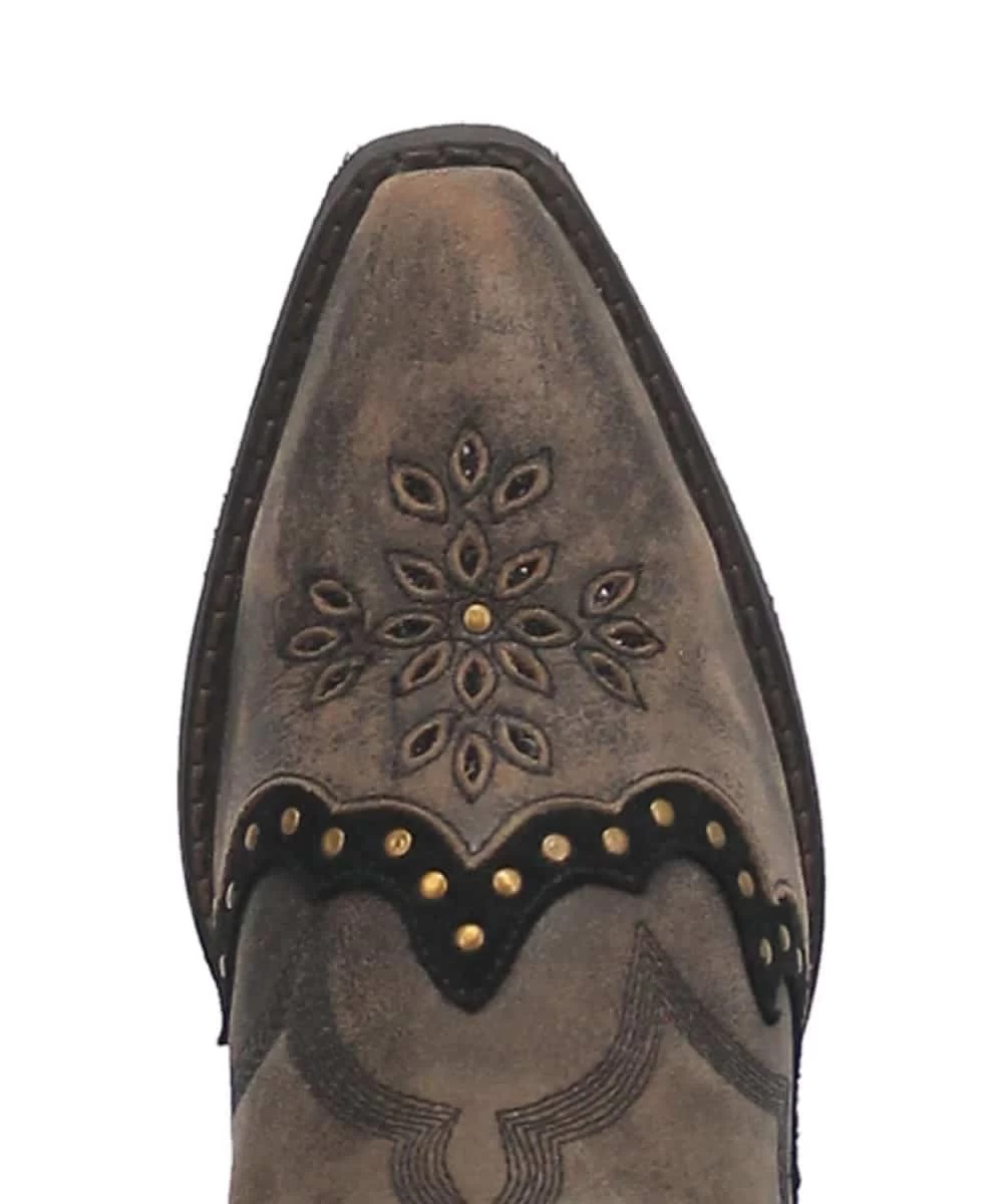 Genuine Leather; 12″ Shaft; Pull Tabs; Wide Calf; Cushioned Footbed; 1″ Medium Cowboy Heel; Snip Toe; Composite Outsole; Dark Brown Leather; Brown Floral Embroidery; Bronze Studded Accents; Style #52413