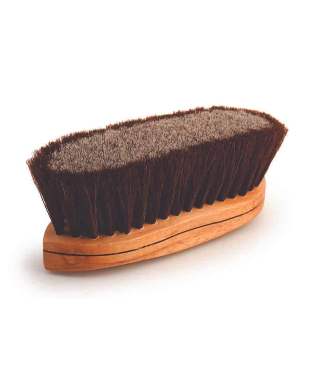 Kiln Dried, Double Lacquered, Curved Back Hardwood Brush Block; 100% Premium Horsehair Bristles; Soft Brown Border With Palamino Grey Center; Measures Approximately: 8 1/4″ x 2″; High End, All Purpose Grooming Brush; Style #20235-1