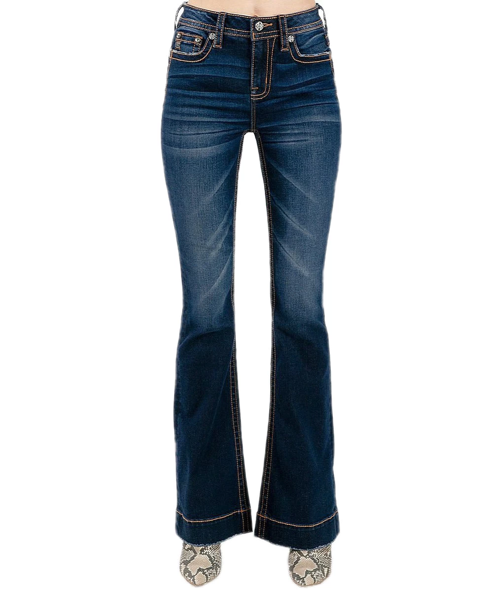 93% Cotton/5% Polyester/2% Elastane; High Rise; Dark Wash; Five Pocket Styling; Whiskers; Fading; Chevrons; Accent Stitching With Miss Me Logo Back Pocket; Rough Edge Hem; Flare Leg; Style #H3636F35