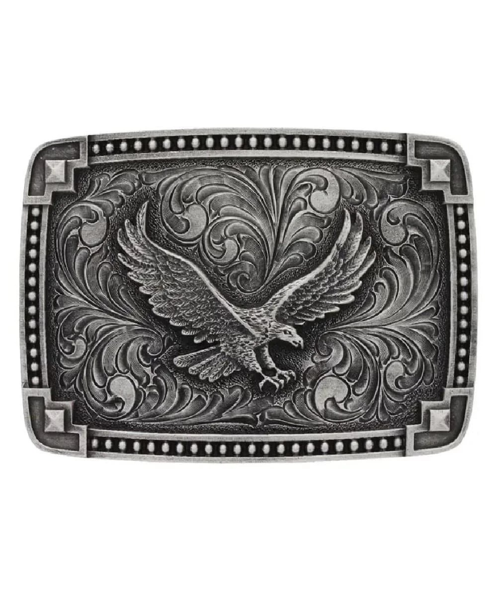 Silver Plate Over A Solid Cast White Metal Alloy Base; Antiqued Silver Finish; Large Soaring Eagle Center Figure; Silver Floral Etching As The Background; Large Square Pinpoints Edge The Buckle With Geometric Accented Corners; Standard 1.5″ Belt Swivel; Style #A566