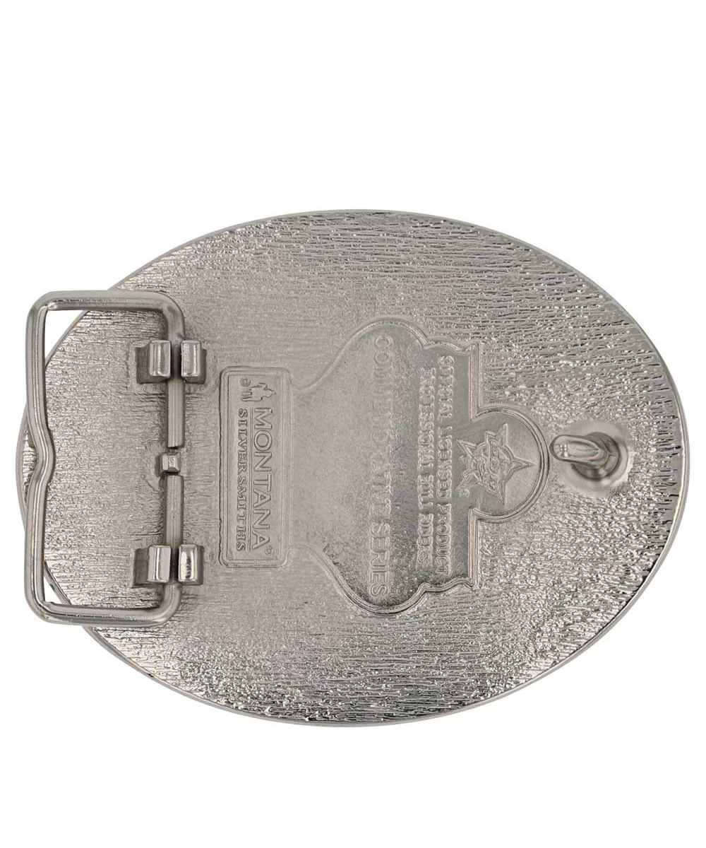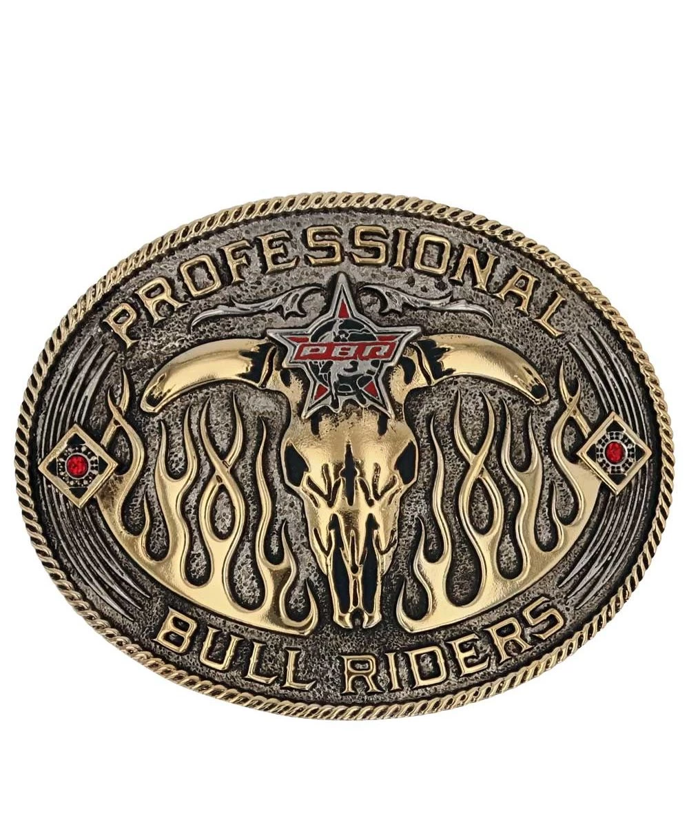 Silver And Gold Over A White Metal Alloy; Epoxy Paint; Oval Belt Buckle; Large Gold Skull In Center; Gold And Black Paint PBR Logo At The Top; Antiqued Silver Background; Gold Flames Decorate Both Sides Of Skull; Gold Lettering Reads: “Professional Bull Riders” At Top And Bottom Of Buckle; Red Stone Inside Gold Diamond Shape On Left And Right Side; Gold Rope Trim Detail; 1.5″ Belt Swivel; Measures Approximately: 4.13″ W x 3.23″ H; Style #PBR941