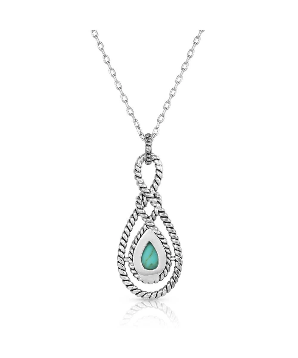 Rhodium Over Brass; Center Teardrop Shaped Synthetic Turquoise Stone; Silver Tone Twisted Rope Knot Wrapping Around Centerpiece; 18″ Silver Tone Chain; Style #NC5468