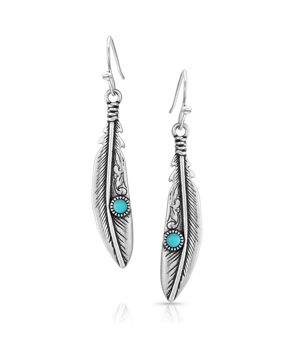 Silver Over Brass; Feather Shaped Dangle Earrings; Synthetic Turquoise Stone With Intricately Detailed Accents; Hypoallergenic Stainless Steel French Hooks; Style #ER5486