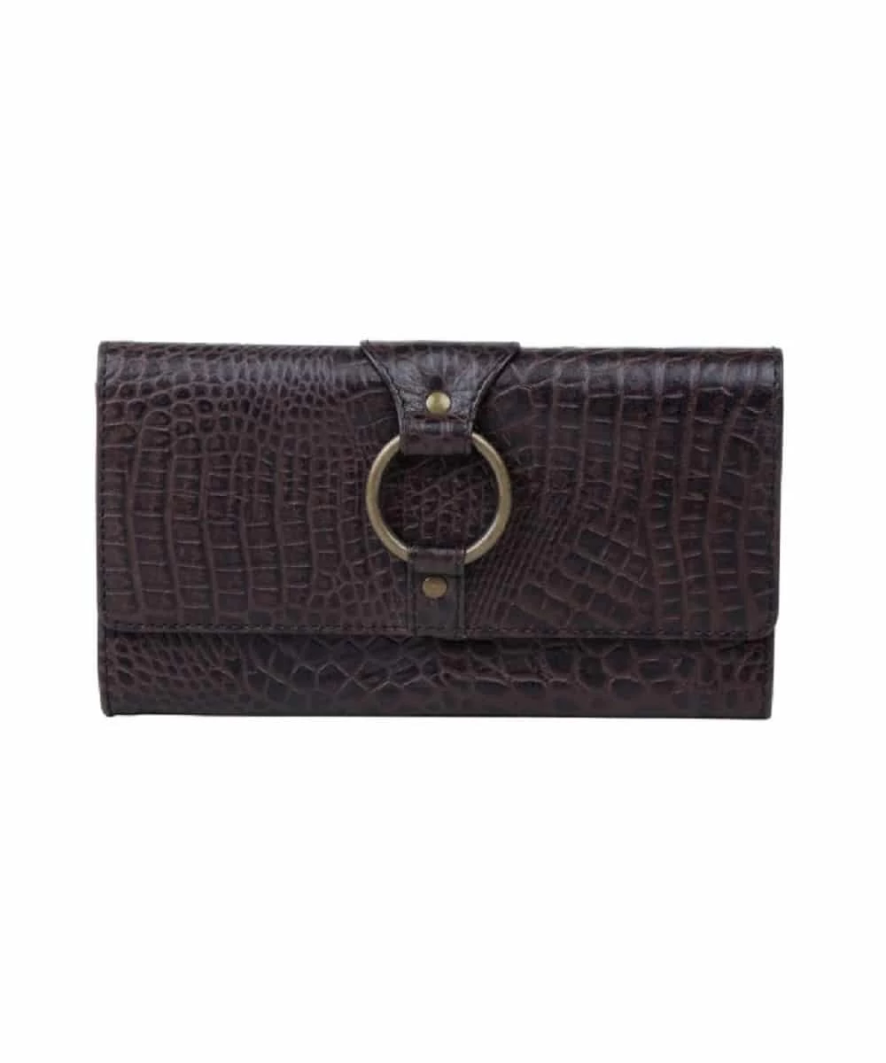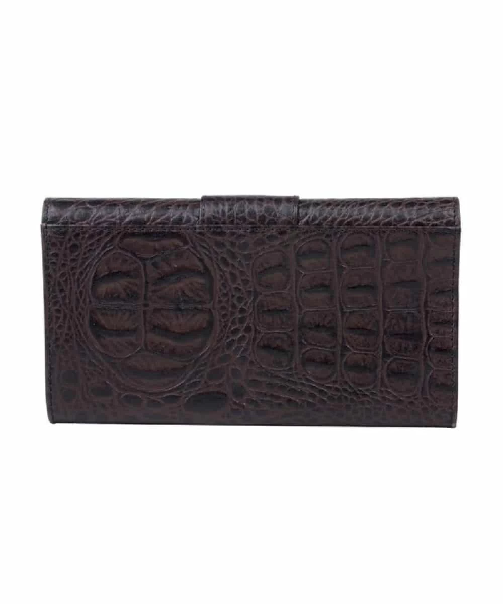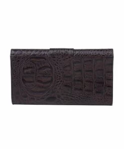 Leather Construction; Embossed Croc Print Design; Magnetic Flap Closure With Brass Ring Accent; Single Interior Zip Pocket; Multiple Card Slots; Cash Compartment; Color: Black/Burgundy; Measures Approximately: 7 1/2″ W X 4″ H; Style #S-4925