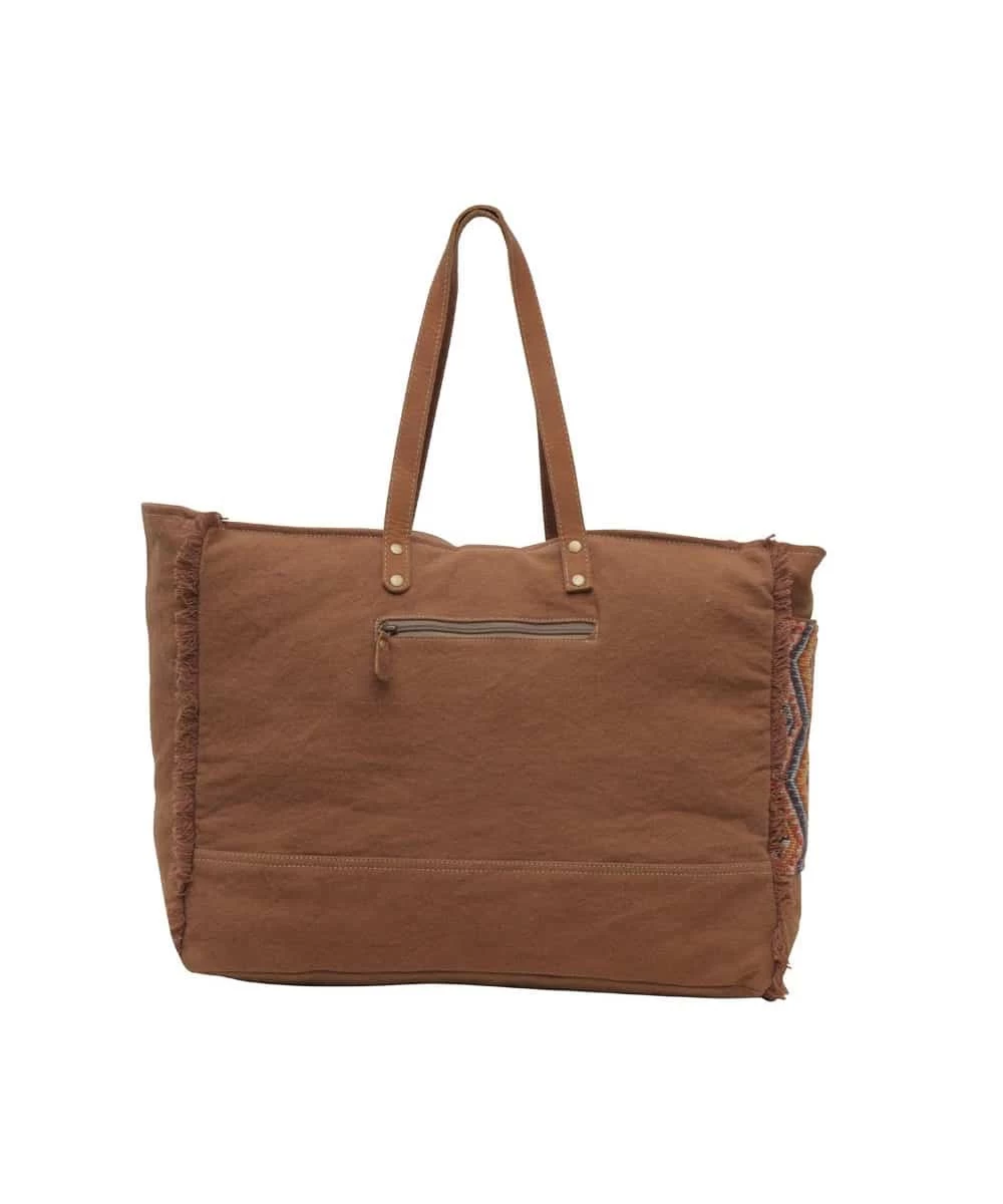 Canvas And Leather; Geometric Pattern On Canvas; Hair On Leather Strap Along Bottom; Hair On Leather Snap Closure; Raw Edges; 1 Exterior Zip Pocket; 1 Interior Zip Pocket; 11.5″ Handle; Measures Approximately: 20″W x 9″D x 16″H; Style #S-5636