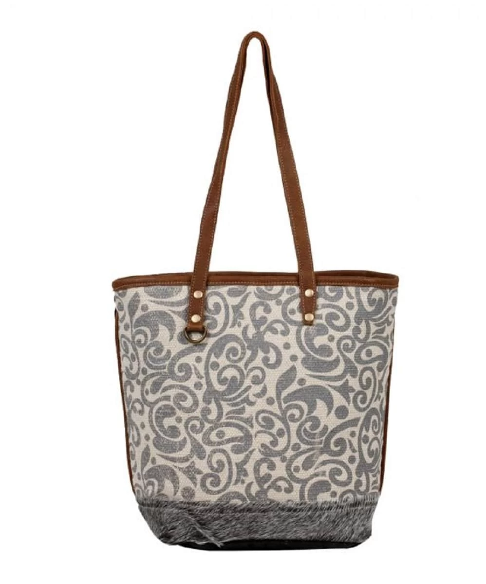 Canvas, Rug, Leather, And Hairon Material; Gray And White Floral Pattern On Front; Hairon Strap On Bottom Front; Back Zippered Pocket; 12″ Handle; Measures Approximately: 16″W x 6.5″D x 13″H; Style #S-2542