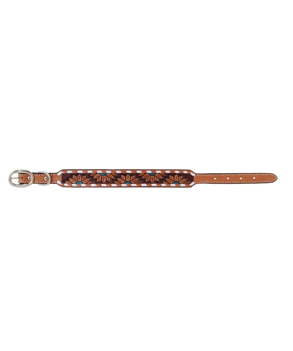 Size Medium, 15″-17″; Hand Tooled Leather; Hand Painted Sunflowers With White Buckstitch; Finished With A TT Finish; Silver Toned Buckle; Style #RTDC416-M