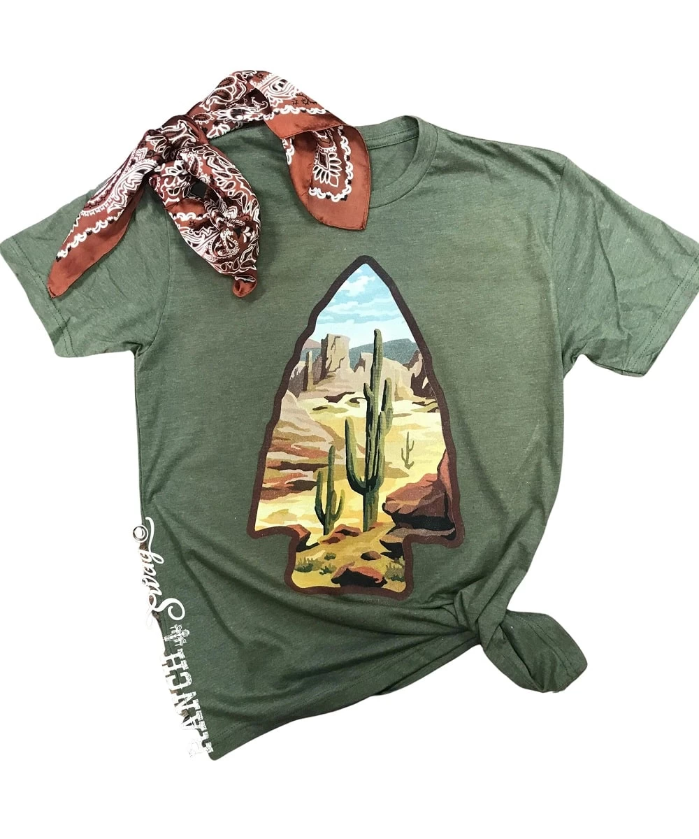 60% Cotton/40% Polyester; Crew Neck; Short Sleeve; Front Arrowhead Scenic Desert Graphic Tee Print; Color: Olive; Style #DESERT ARROWHEAD TEE