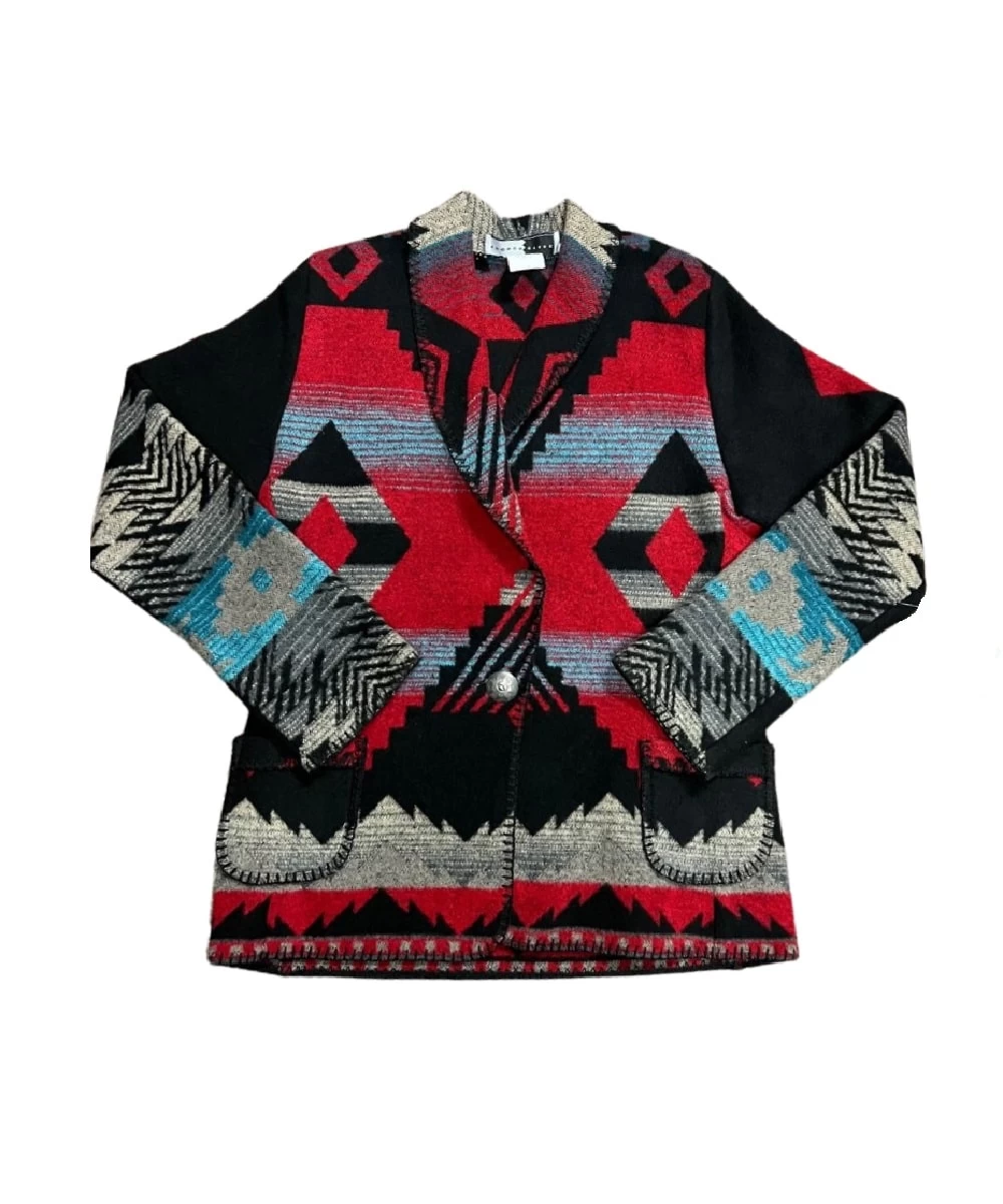 20% Wool/50% Acrylic/25% Polyester/5% O.F.; Single Button Front; Shawl Collar; Two Open Hand Pockets; Western Concho Button; Red, Teal, Gray And Black Southwestern Design; Style #877DK