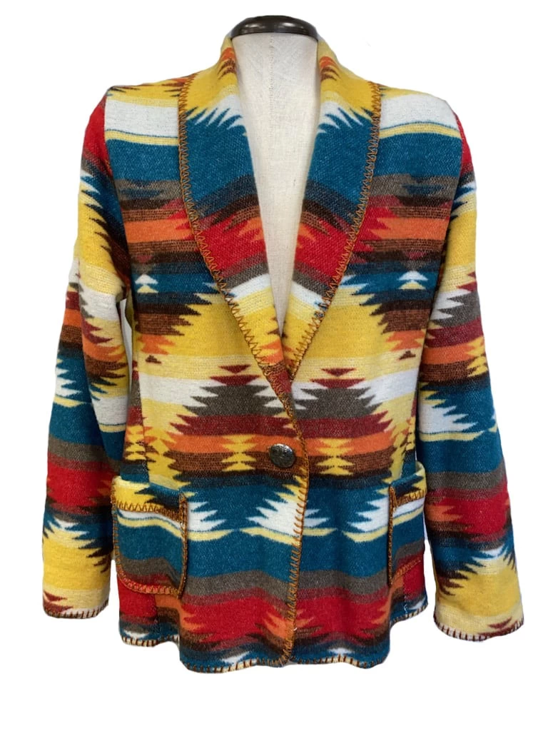 20% Wool/50% Acrylic/25% Polyester/5% O.F.; Unlined; Single Silver Concho Button Closure At Waist; Two Open Hand Pockets; Blanketstitch Trim Edges; Teal, Red, Orange And Yellow Aztec Print; Color: Sunny Daze; Style #877SD