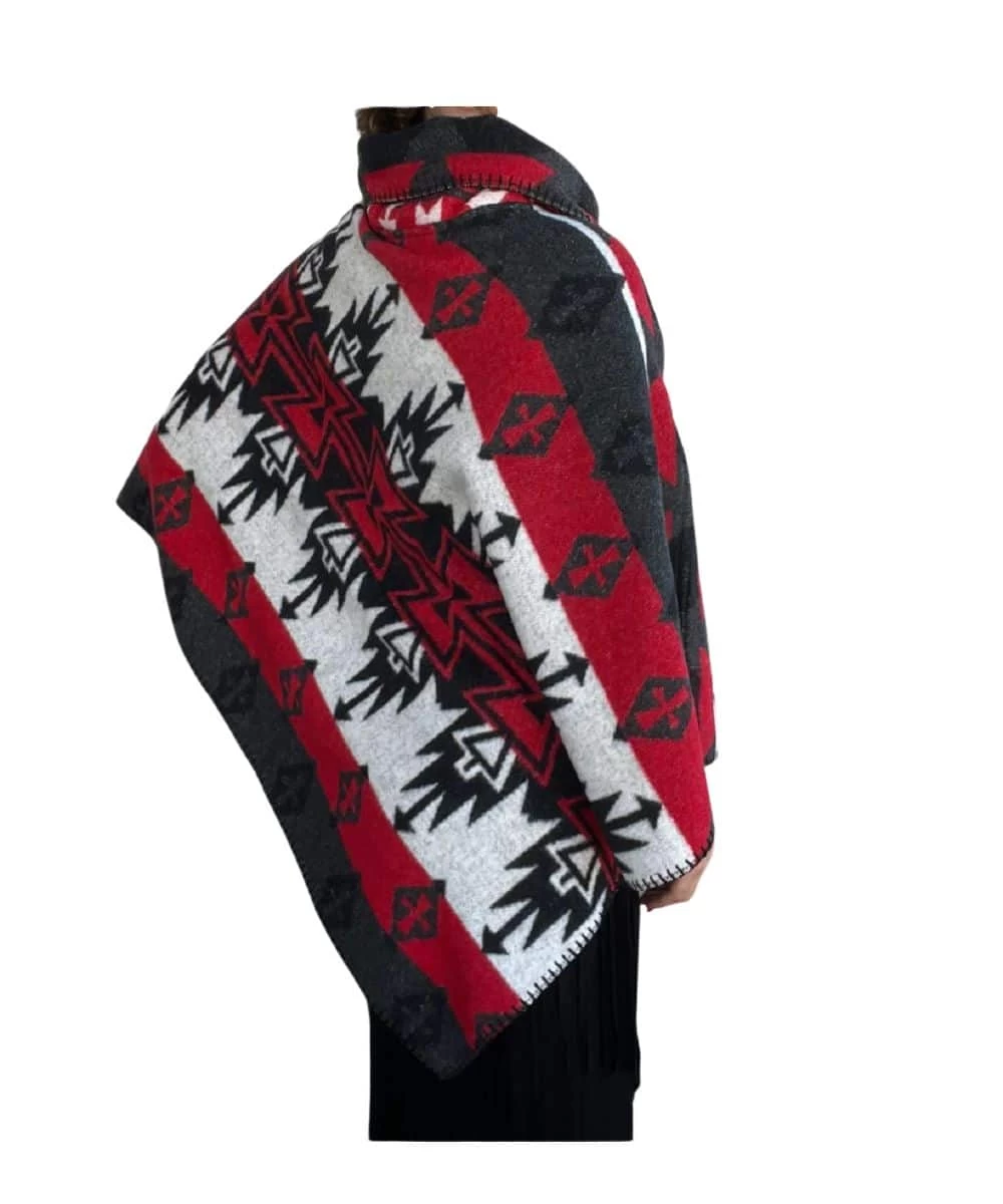 20% Wool/50% Acrylic/25% Polyester/5% O.F.; Reversible Button Collar Poncho; 30″ One Size Fits Most; Color: White Montezuma; Style #208RMW