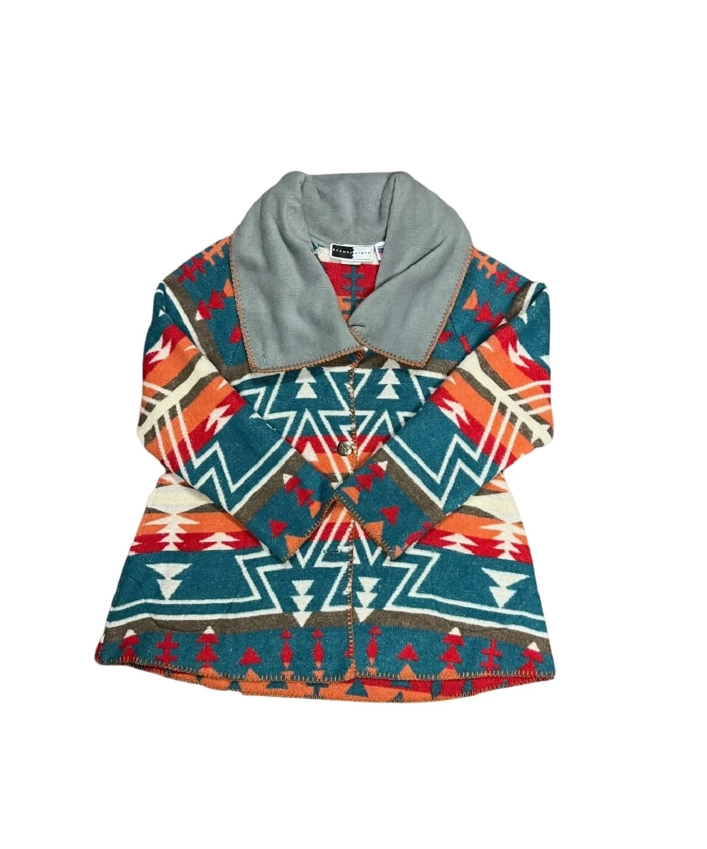 Geronimo Fabric; Slightly Flared Generous Fit; Fleece Lined Button Collar; 4 Button Front; Two Side Seam Pockets; Color: White, Teal, Red, And Orange Southwest Print Design; Style #920B-ZTL