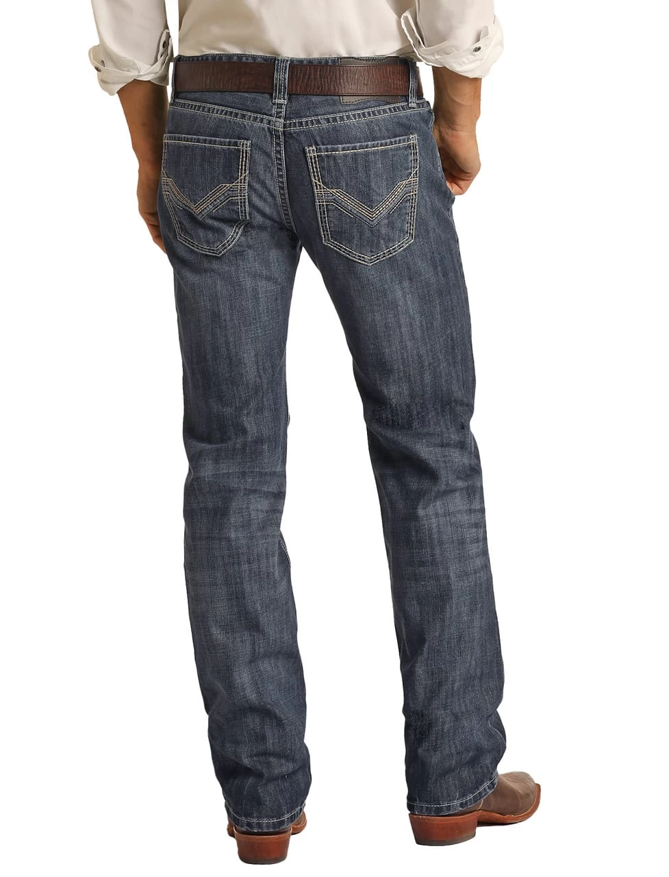 100% Cotton; Dark Vintage Wash; Style: Pistol; Regular Fit; Five Pocket Style; Light Whiskering; V Two Tone Rear Pockets; Fashionable Stitching On Rear Pockets; Bootcut; 18 1/2″ Leg Opening; Style #RRMD1PRYWP