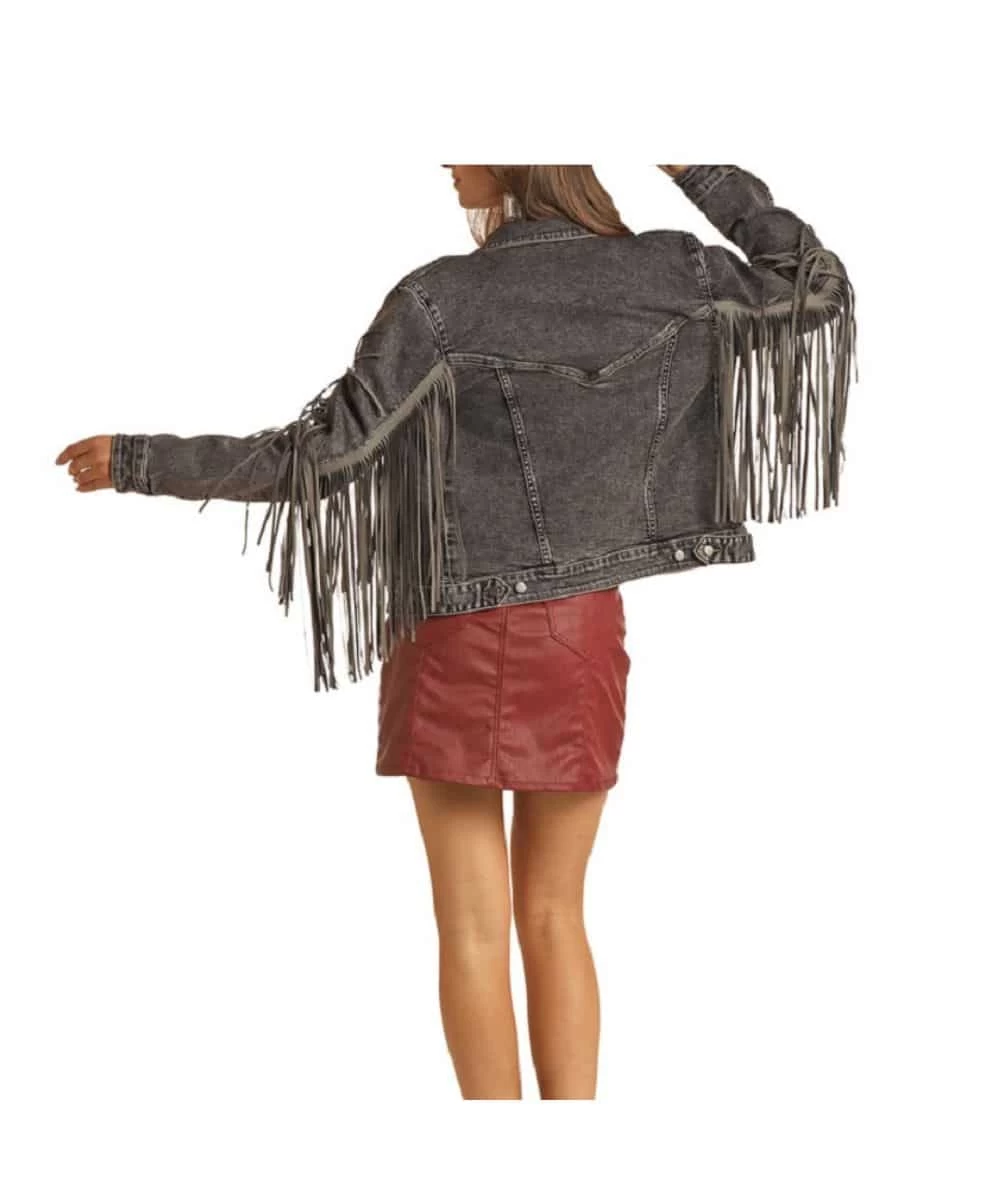 94.5% Cotton/4% Polyester/1.5% Spandex; Relaxed Fit; Long Sleeve Denim Jacket; Open Collar; Button Front Closure And Cuffs; Dual Chest Pockets; Two Open Hand Pockets; Single Point Back Yoke; Fringe Front And Back; Color: Distressed Black; Style #52_1718