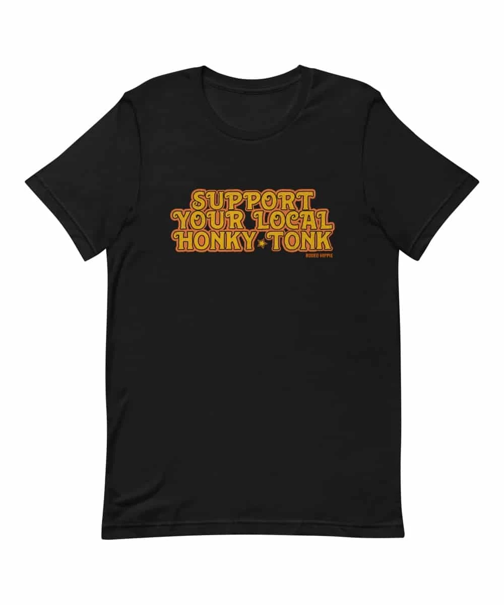 100% Combed And Ring Spun Cotton; Crew Neck; Front Gold And Orange Graphic Tee Print Reads: Support Your Local Honky Tonk; Color: Black; Style #HONKY TONK TEE