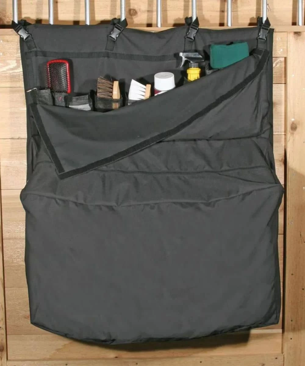 Durable 600 Denier Polyester; Hangs Neatly On Stall Fronts; Attaches To Stall Front With Four Nylon Straps With Quick Release Buckles; Eight Mesh Pockets Hold Grooming Supplies; Spacious Zippered Compartment Holds Blankets, Sheets, Bell Boots, And Wraps; Perfect For Awards, Can Be Embroidered; Measures Approximately: 36″ W x 37″ Overall Length, Grooming Pocket: 15″ H x 36″ W, Zippered Compartment: 22″ H x 12″ D x 36″ W; Color: Black; Style #18356