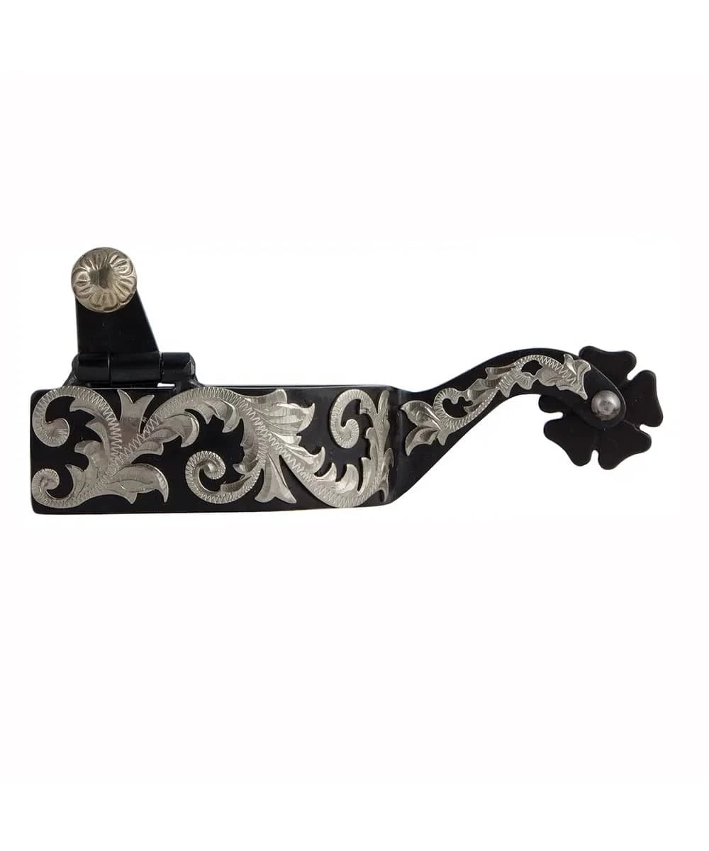 Black Steel Spur With Silver Plate Filigree Overlay On Band And Neck; Black Steel With Rust Over Time Leaving A Beautiful Antique Finish; 1″ Band Width; 2″ Neck Length; Cloverleaf Rowel; Color: Black/Silver; Style #SB35975