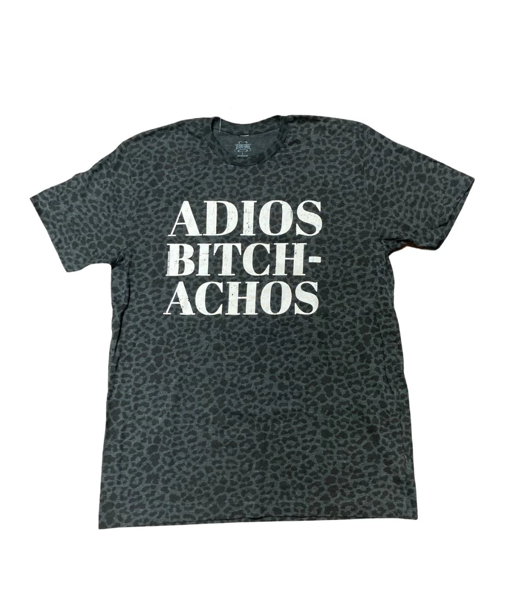 50% Polyester/ 25% Cotton/ 25% Rayon; Color: Heather Gray With Black Leopard Print; Design Says “Adios Bitchachos”; Short Sleeve; Style #LAT6901