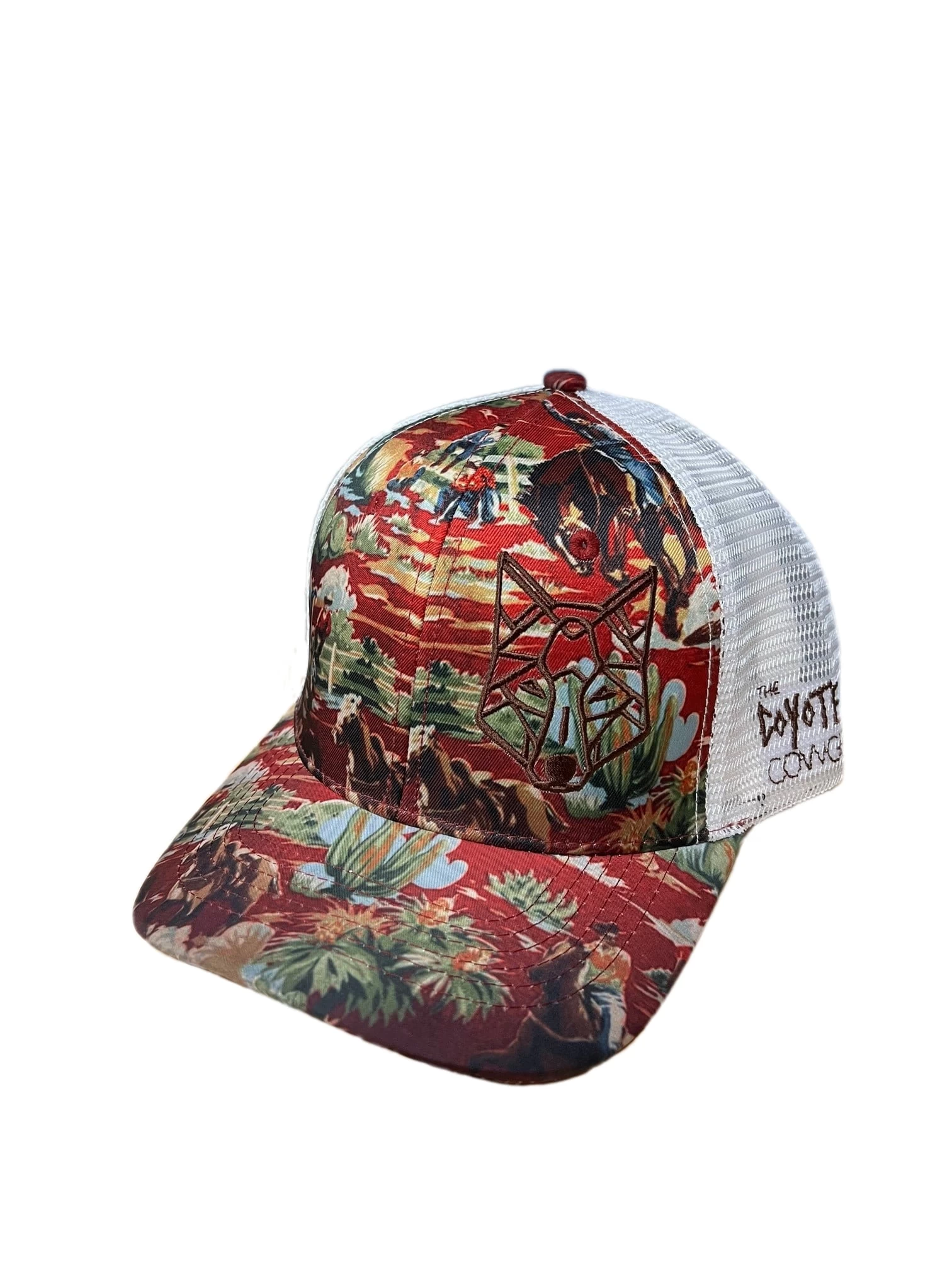 Six Panel Construction; Red Scenic Horse Rider Desert Print; Brown Embroidered Coyote Logo On Left Front Crown; White Mesh Back; Brown Logo Print On Left Side; Snap Back Closure; Style #RED CAP