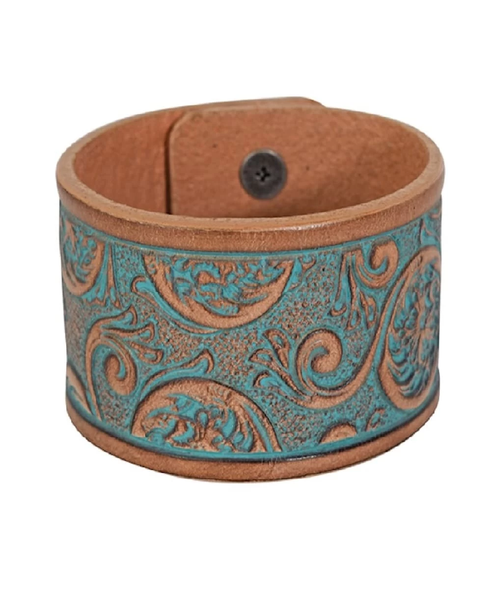 100% Genuine Leather; Blue Tooled Leather; Snap Closure; Measures Approximately: 2.5″W; Style #22071BJ3