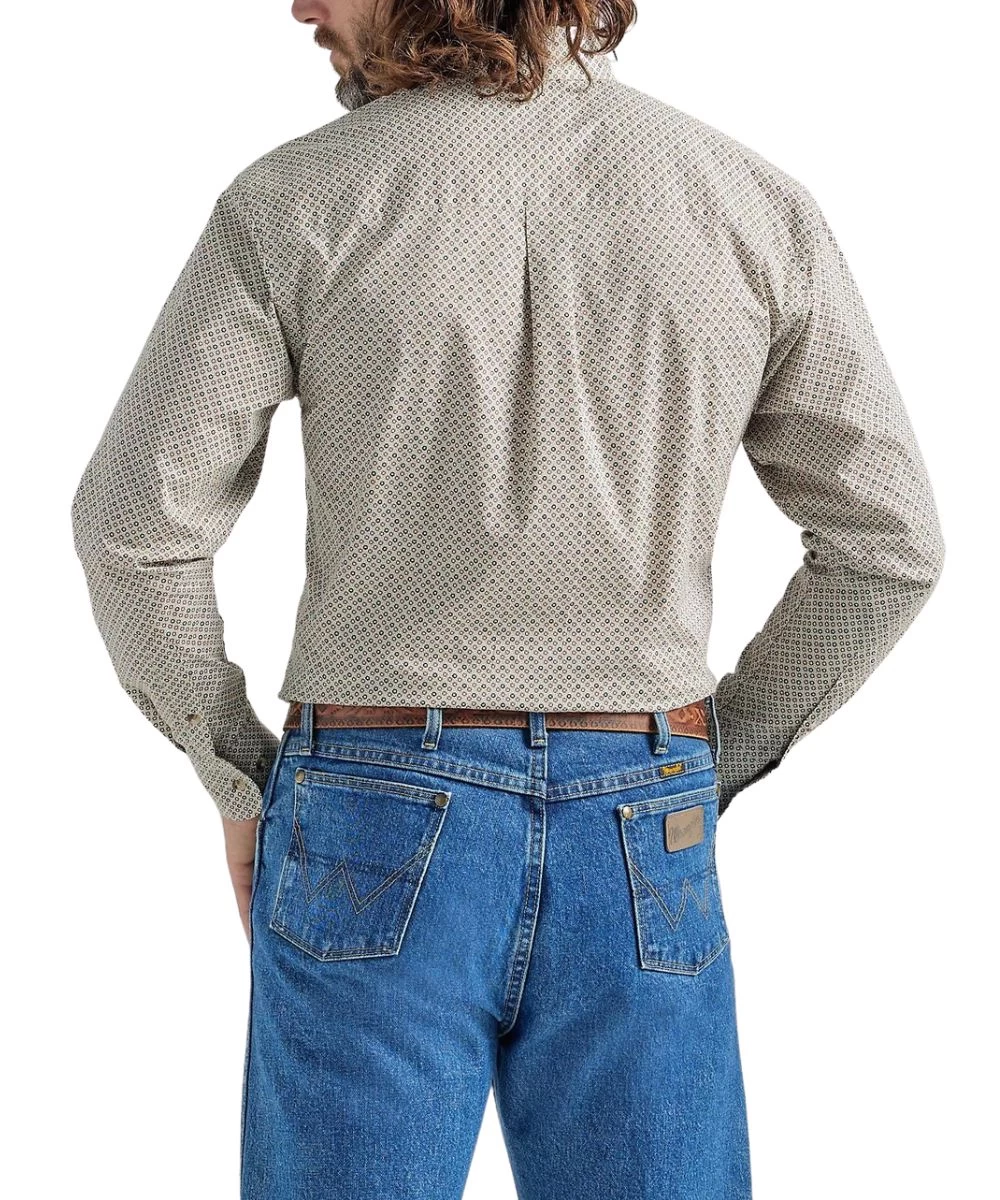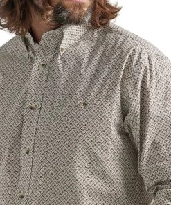85% Cotton/15% Polyester; Relaxed Fit; Long Sleeve; Button Down Collar, Placket, And Cuffs; Single Button Through Chest Pocket With Logo Embroidery; Straight Back Yoke With Pleat; Contrast Interior Trim; Curved Hem; Color: Olive Green Geo Print; Style #112324877