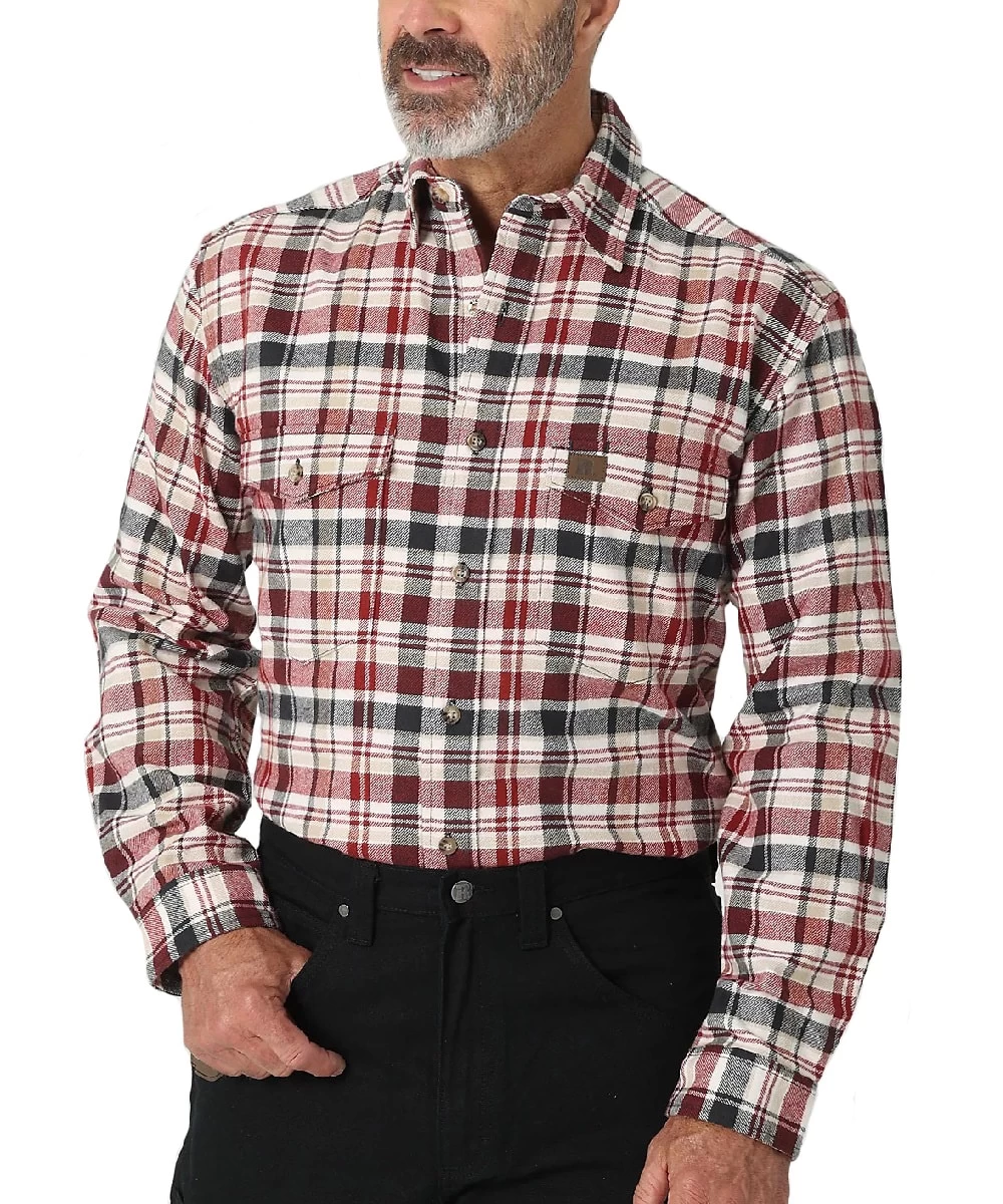 100% Cotton; Classic Fit; Riggs Workwear Heavy Weight Flannel; Long Sleeve; Spread Collar; Button Down Front And Cuffs; Two Button Through Chest Pockets; Straight Back Yoke; Red And Black Plaid; Color: Brick; Style #112317235